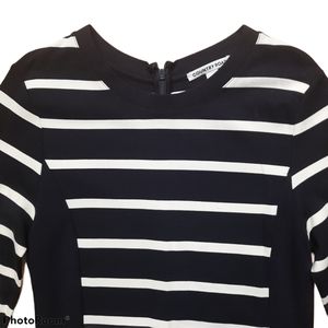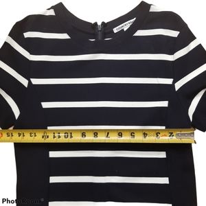 Black and white striped sheath dress. Black side paneling for very slimming effect. Material is a bit stretchy. No lint. Very good condition.