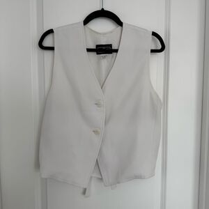 This crisp white blouse features a sleeveless design and a boxy silhouette, offering a modern and versatile look.