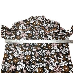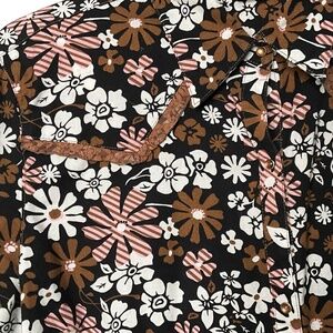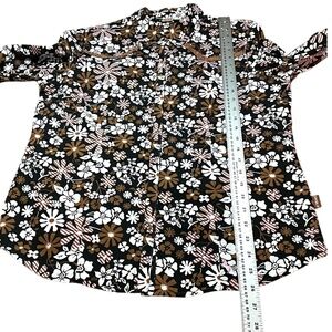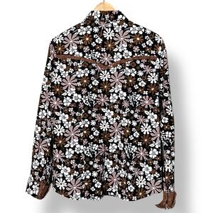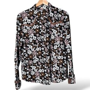 In very good pre owned condition. Shades of Brown, Black, Pink Floral on a white background. Brown Pearl Snap Closure. Turn back cuffs with lace on the underside and brown pearl snap closure. Western yoke back trimmed in brown lace. Photos are important so please check all for condition, detail and measurements.
