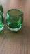 Line new condition. Emerald Green to clear Glass Votive candle holders 3" tall and 2 1/2" in diameter beautiful dark emerald green with crystal clear base. Handblown. 1 holder has a blemish on rim which is the nature of handblown glass.