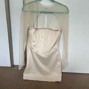 The chicest dress you'll wear this holiday season, this super wearable mini dress is the perfect party piece. Cut from stretch satin and soft mesh in a delicate cream hue, the fully corseted bodice cinches the waist, topped with sparkling crystals along the curved neckline and the chic shoulder overlay creates a revealing open front.
