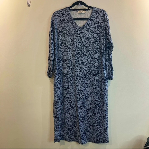 CREAM Sz M Leopard Print Pockets V-Neck Slits Ruched Sleeves Evening Gown Dress. Super soft.