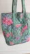 Creation Alpac quilted fabric large tote bag with double handles and a front pocket. Closes with two velcro closures near the straps on interior. Interior is grey and exterior is grey, pink and green tropical floral and parrot design. 50% cotton/50% polyester. Made in France.