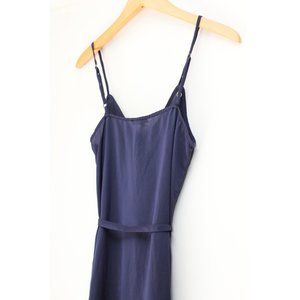 Elegant button up dress with spaghetti style straps and self tie belt that can be tied around the front or to the back. This lightweight flowing design is finished in a classic navy blue.