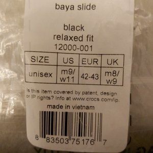 Brand New in crocs bag. Never worn. Black Unisex Size 9M's, 11 W . Baya Slide is a little wider in fit, Relaxed fit. Perfect condition, no flaws.