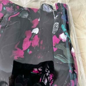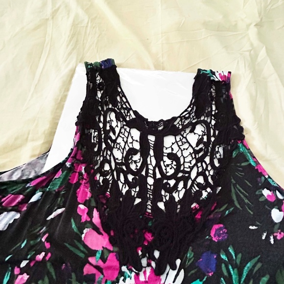 CROCHET DETAIL TUNIC, BLACK MULTI (Black, White, Pink, Green, Purple), SIZE 4X, SLEEVELESS, DEEP SCOOP NECK, FEMININE FLORAL, RAYON SPANDEX, PENNINGTONS, IN BAG, TAGS ON, NEVER WORN