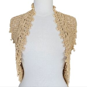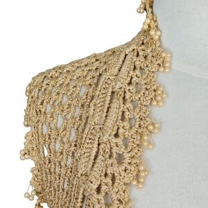 Beautiful crochet vest in a natural tan color, with off white faux pearl accents.