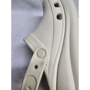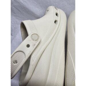In good used condition. Some scuffing to strap and light discoloration on tred. Crocs have been scrubbed cleaned to the best of ability. See all photos.