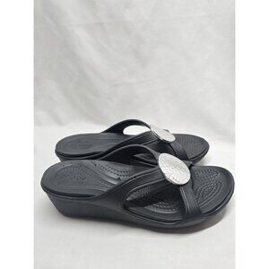 CROCS Sanrah Sandals Women’s Sz 7 Black Hammered Silver Circle Wedge- FLAWS