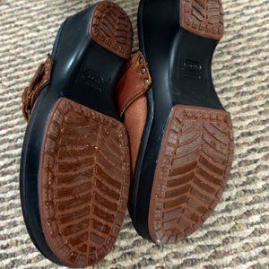 Genuine leather, sturdy. Worn once, heel is too high for me.