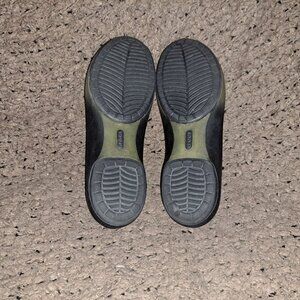 The product is a pair of Crocs Carlie ombre white and black peep toe flats in size 6.