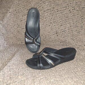 CROCS-Sanrah Metalblock Strappy Wedge Sandals-Black/Silver-Sz 10-NWOB