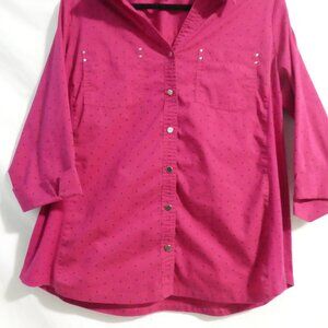 A stylish magenta button-up shirt with a dotted pattern.
