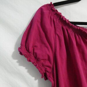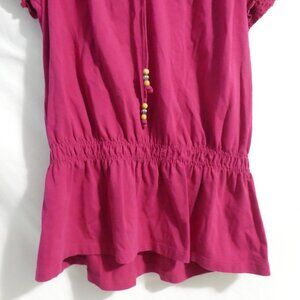 A stylish pink blouse with short sleeves and over the shoulder neckline