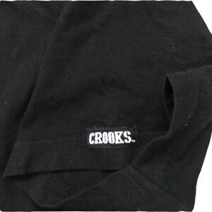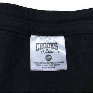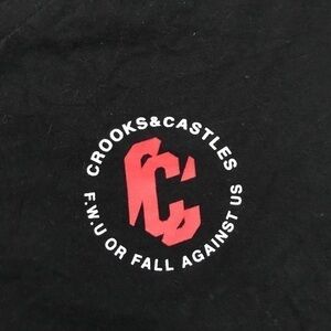 Black with classic red and white logo from Crooks and Castles. Design on front and back, with the logo loops on each sleeve. Size small or approximately 35” bust
