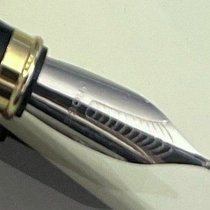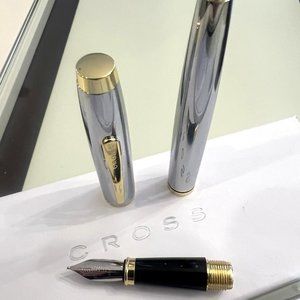 Introducing the luxurious CROSS brand fountain pen made of steel with gold accents. Perfect for elevating your writing experience, this fountain pen is a must-have for any pen enthusiast. The steel body provides durability and a sleek look, while the gold accents add a touch of elegance to the overall design. Whether you're using it for personal or professional use, this fountain pen is sure to impress. The CROSS brand is known for their high-quality pens, and this fountain pen is no exception. Elevate your writing game with this CROSS brand steel with gold accent fountain pen!