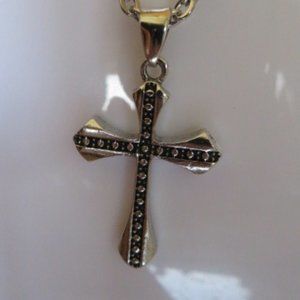 Silver and black alloy cross/crucifix necklace, 13" long.