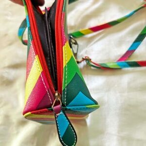 CROSSBODY BAG, RAINBOW MULTICOLOUR, VINYL, TOP ZIPPER, LINED, SHOULDER STRAP, HAS POCKETS, NEW NEVER USED, NO DAMAGE