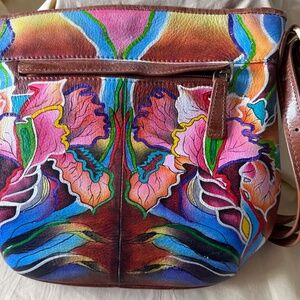 CROSSBODY LEATHER BAG, SHARIF ARTISTIC EXPRESSIONS, ORCHID MULTICOLOUR, TOP ZIP CLOSURE, OUTER ZIP POCKET, 3 INSIDE SLIP POCKETS, INSIDE ZIP POCKET, ADJUSTABLE BUCKLE SHOULDER STRAP, SLEEPER BAG, USED ONCE, NO DAMAGE