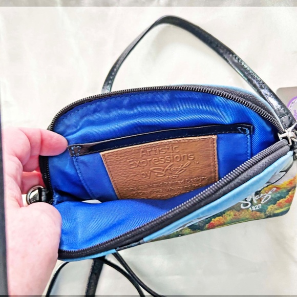 CROSSBODY MINI BAG, LEATHER, HAND-PAINTED GEESE, TOP ZIP CLOSURE, REMOVABLE/ADJUSTABLE BUCKLE CROSSBODY STRAP, by SHARIF, TAGS ON, NEW NEVER USED, NO DAMAGE