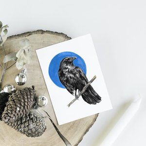 A print of a watercolour and gouache painting inspired by the crow who brings us notice of change and belief in magic.
