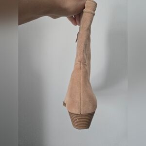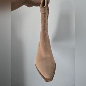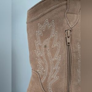 Step out in style with these tan suede western boots. Perfect for any occasion, these boots offer both comfort and elegance.