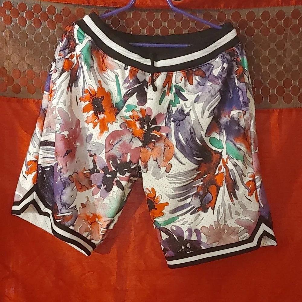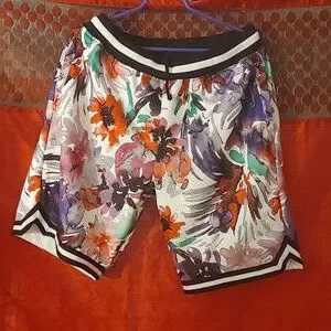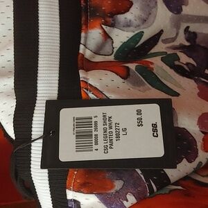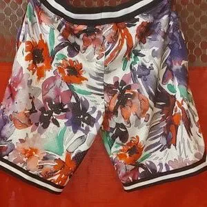 NWT painted white pink. 100% polyester. Mesh inside and pull string waistband and elastic. Waist without pull 17 Length 22 Rise 13 Inseam 10 Hips 27
