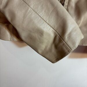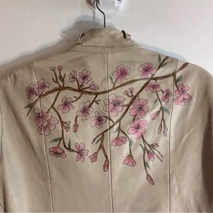 CUERO Sz M Leather Jacket Handpainted Cherry Blossoms Zipper Closure Lined Pockets. Elevate your style with this elegant cream jacket featuring delicate handpainted floral. Perfect for any occasion, this jacket adds a touch of sophistication to your wardrobe. Whimsical and fresh. Unique statement piece.