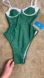 NWT green balconette bra style swimsuit with high cut hips, a chunky white trim, and key hold back cutout. Perfect for a day at the beach or vacation!