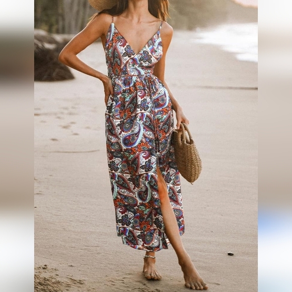 CUPSHE Women's Plunging V Neck Backless Beach Dress Cami Straps Empire Waist High Slit Maxi Summer Dress, Size Medium