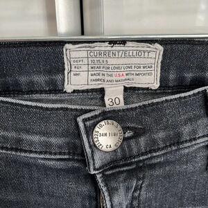 CURRENT ELLIOTT Everett stiletto high waisted jeans. The high-rise stiletto is featured in a super soft and stretchy fabrication that anchors comfortably at the hips while being cut in a slim and sleek silhouette without ever losing its shape. This classic skinny design is fitted through the knee with a clean ankle length inseam - ideal for an everyday, casual look. Black-grey wash color with 5 pocket design. Button and zipper closure. Excellent condition worn a few times. I fixed a tear in the leg (see pic) so it won’t fray.