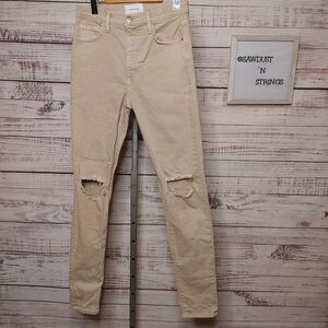High rise factory distressed light tan jeans by Current Elliot. Sold on Revolve. In excellent condition. No stretch. See photos for measurements.