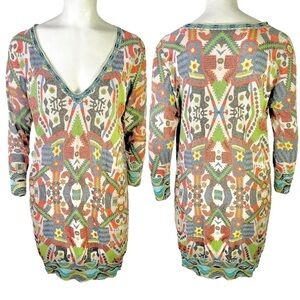 CUSTO BARCELONA MULTICOLOUR AZTEC GEOMETRICAL BODYCON DROP SHOULDER BELT DRESS KNIT DRESS PLUNGING NECKLINE LARGE