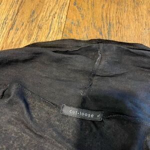 Veste noire légère signée Cut Loose, probablement en mélange de lin. Devant fluide, manches 3/4 et ourlet asymétrique. Tissu respirant, légèrement transparent. Taille L indiquée. Idéale pour superposer avec élégance.