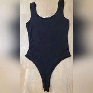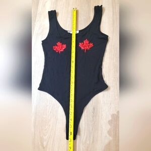 CUTE Unique small black bodysuit with sequin mapleleafs on chest. Fits small but stretchy, see measurements in photos to make sure it will fit.
