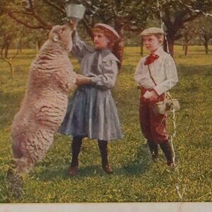 Children in Victorian outfits feeding a very large sheep that is standing on his hind legs.