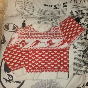 Red and cream sweater with hearts and skiers motif. Very soft and cozy, great for après-ski.