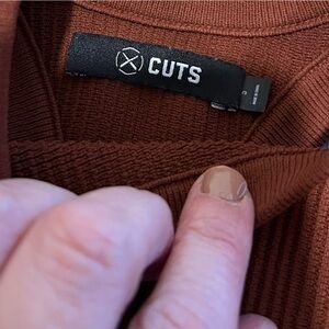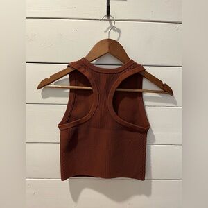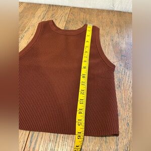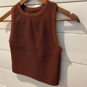 Stylish and versatile, this CUTS cropped tank top is perfect for layering or wearing on its own. Made from a ribbed stretch fabric, it hugs the body comfortably while offering a flattering fit. The rich rust brown color adds a warm, earthy touch to any outfit. Features a high crew neckline and racerback design for a sporty yet refined look. Size Small.