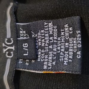 3/4 sleeve black rayon/poly blend mini dress with white colour blocking. Diagonal zippered front pockets,back zipper. Medium weight soft fabric. lg