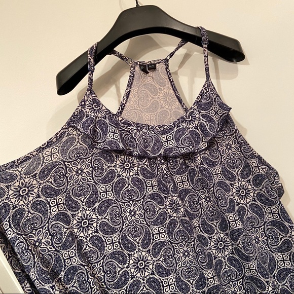 There are adjustable straps. There is short slifs on either side. Ruffles on the chest and cinched at the waist for a flattering look.