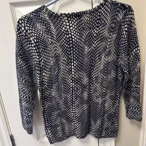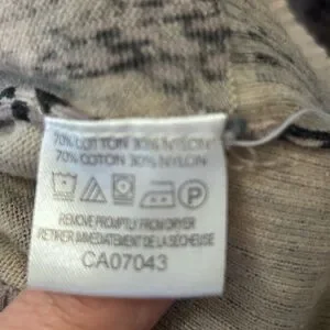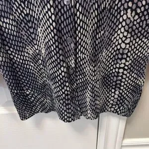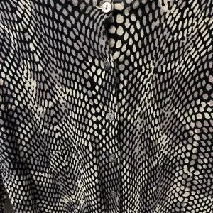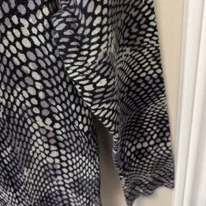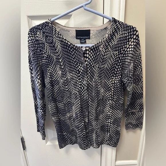 Size Medium snakeskin patterned sweater. 3/4 length sleeves. Button up front of sweater. 70% cotton 30% nylon. Grey/mauve colour. EUC