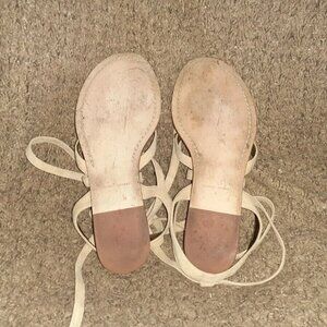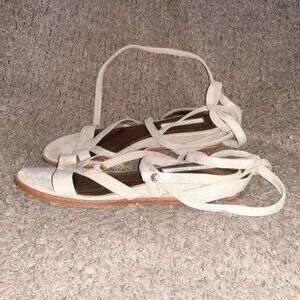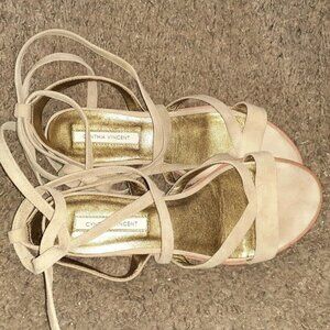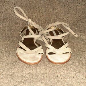 CYNTHIA VINCENT-Patience-Latte Suede-Ties-Mini Wedge Flat Sandals-Sz 8-Excellent