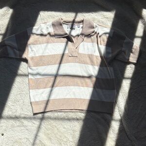 Bring preppy chic to your casual collection with this CYRUS striped polo sweater, Size Medium, in excellent condition. Featuring tan and cream stripes, a collared V-neck, and short sleeves, this knit top blends easy elegance with a classic wardrobe refresh.