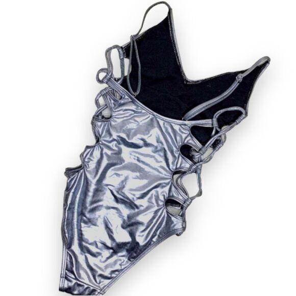 Super Sexy Metallic Pewter Silver Lace Up Side CutOuts With A Pluge Neckline. The Laces Are Thicker And Are Doubled On Each Side. Adjustable Straps, Removable Pads, Fully Lined. NWOT, Never Worn, This is a true small, could fit an xs as well. This fabric is a thicker material, Not a ton of stretch in the bust. I love this suit but was too busty for it. Perfect for a festival!