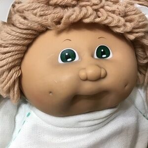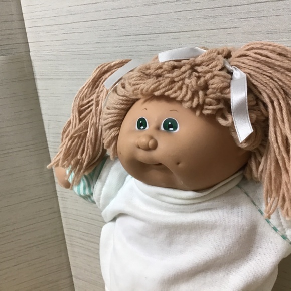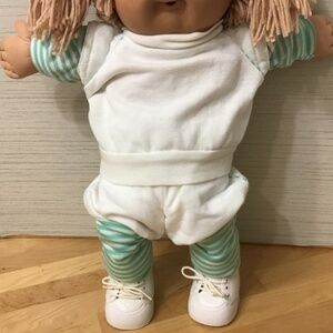 This cutie is Poodle Hair KT Factory with KT Factory shoes. She does have fuzzy spots all over her from Velcro and short pieces of the longer hair. She is wearing a very nice Cabbage Patch jogger suit that is not KT Factory. She is clean and is from my collection. She is missing the soother and inside her soother mouth small crack refer to photo. Bundle in my closet to save on shipping.
