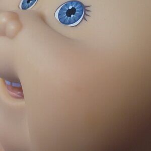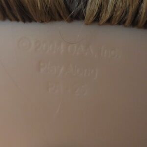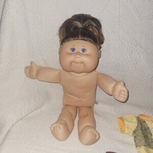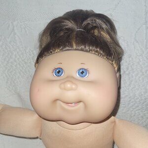 This lovely Cabbage Patch kid from Play Along stamped 2004, PA-25 features a partially toothless smile. She has 2 toned brunette hair with dark blonde hilites. I have brushed her hair and placed in a ponytail. She has the start of 2 micro braids near her temples I have not removed. She actually has a light chocolate scent. She has been surface washed and may have the odd light smudge or mark, but is in good overall condition. Her face has a few shiny rub spots. All original paint. Please see pics and video for more on this doll's condition, details, outfit and design. 1 shoe seems a bit loose, but may be as there are no socks. Blue signature and tush tags in nice condition.
