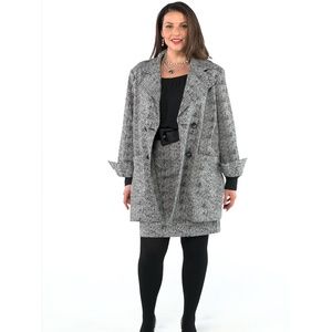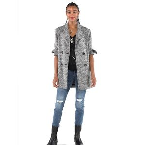 Double-breasted statement jacket with an easy, relaxed fit. It comes in a grayscale herringbone knit with a wide notched collar and patch pockets to stash your essentials.