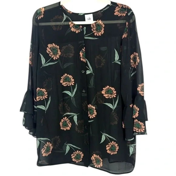 Cabi Black Floral Boxy Blouse with Ruffled Bell Sleeves Size Large