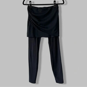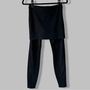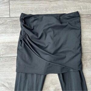 Attached wrap style skirt, ruched on the side. Mesh on front skirt and legging fabric on the skirt back. Mesh has raw edges.