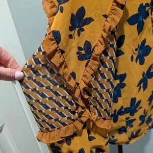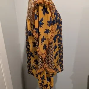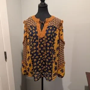 Stylish Cabi top with a geometric pattern. Features brown and blue colors.